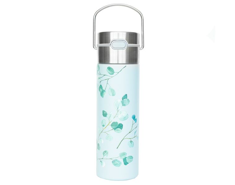 Украшенный листьями эвкалипта термос надолго сохранит температуру вашего напитка. Термос будет отличным компаньоном на активном отдыхе и занятиях спортом.