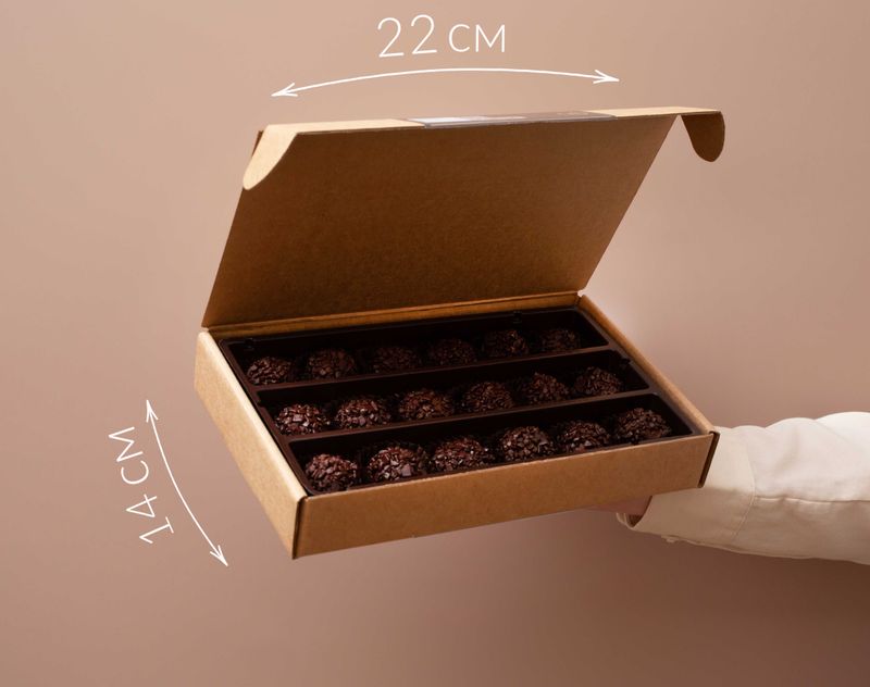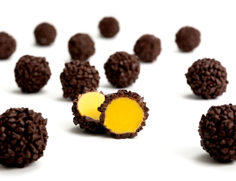Трюфель с добавлением пюре манго и маракуйи. Сочная фруктовая начинка покрыта темным шоколадом.