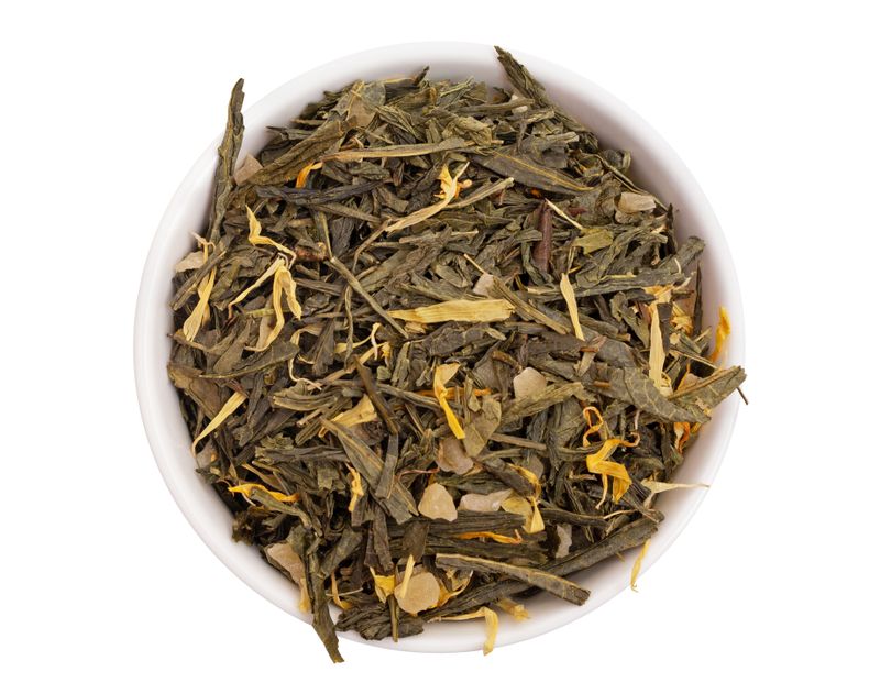 Состав: зеленый чай, цукаты персика, сублимированная морошка, лепестки календулы, ароматизатор.