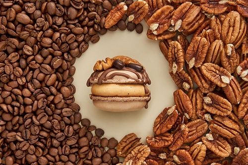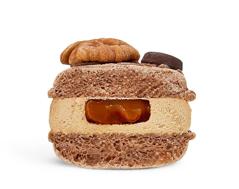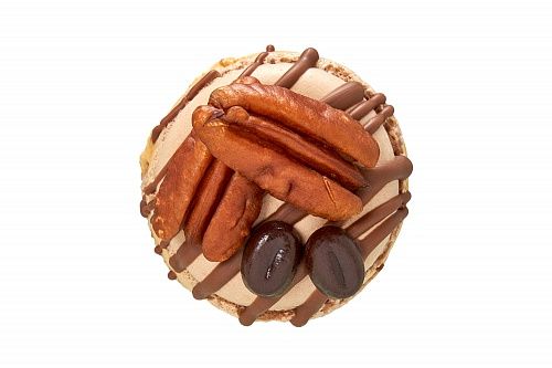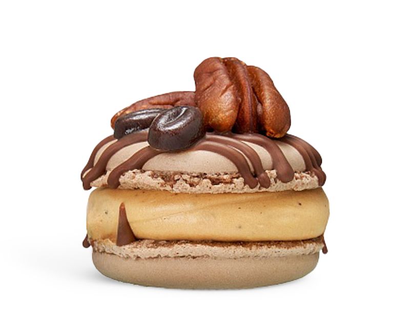 Взбитый в пену шоколадный ганаш с добавлением кофейного крема и фирменной соленой карамели. Пирожное декорировано густой шоколадной глазурью, кофейными зернами и орехами пекан. Объемное пирожное макарон дарит ощущение целого торта в одном пирожном, насыщенный индивидуальный орехово-шоколадный пир и праздник!