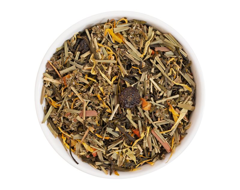 Состав: зелёный чай, лемонграсс, лист малины, яблоко сушеное, вишня, лепестки календулы, ароматизатор.