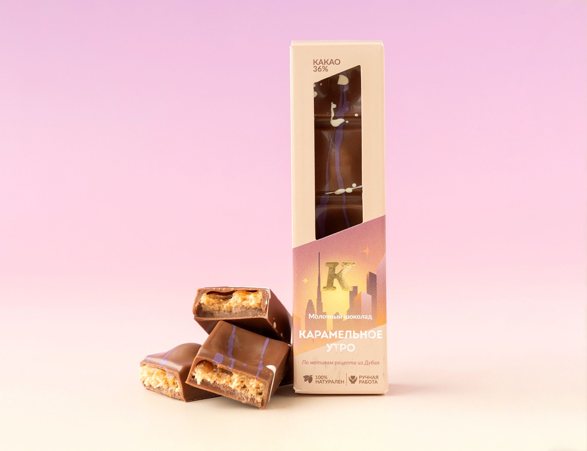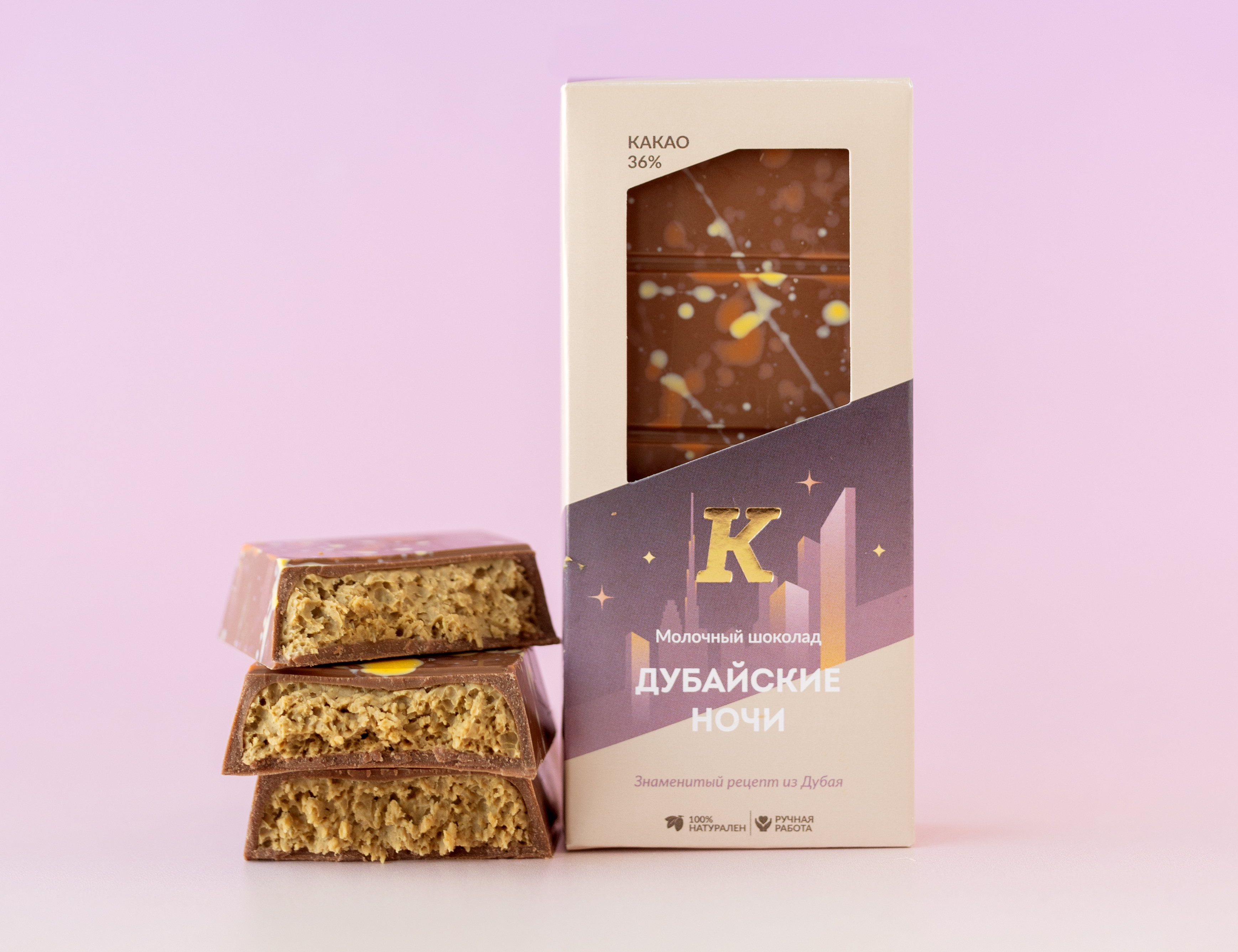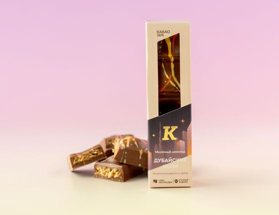 Вдохновившись роскошью и кулинарными изысками Дубая, шоколадная фабрика создала свое прочтение дубайского шоколада, которое не только сохранило узнаваемые черты восточного десерта, но и привнесло мелодию творчества.